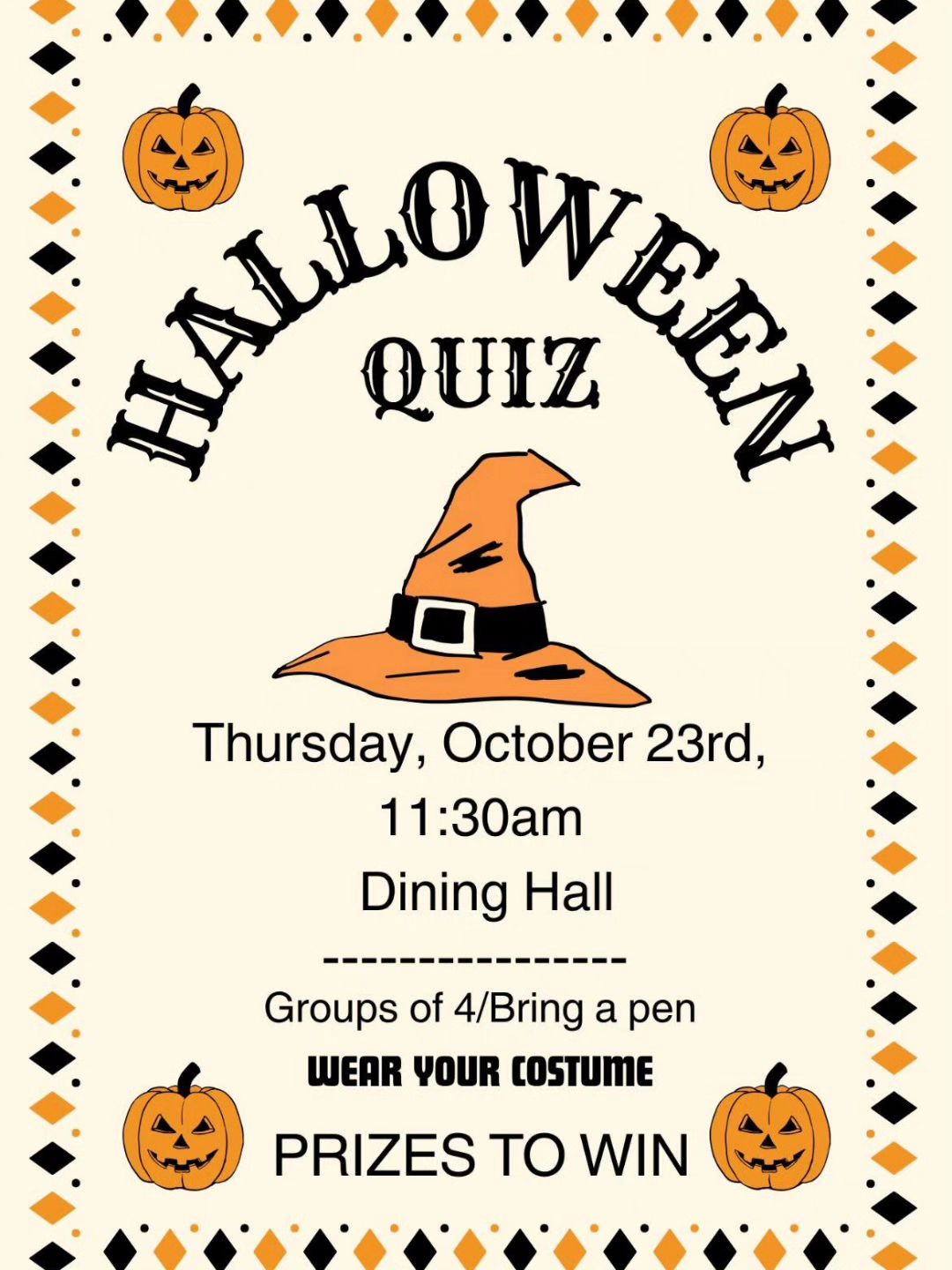 Join us in the Dining Hall for some spooktacular quiz fun. Dress up and grab three of your friends for our Halloween Quiz.