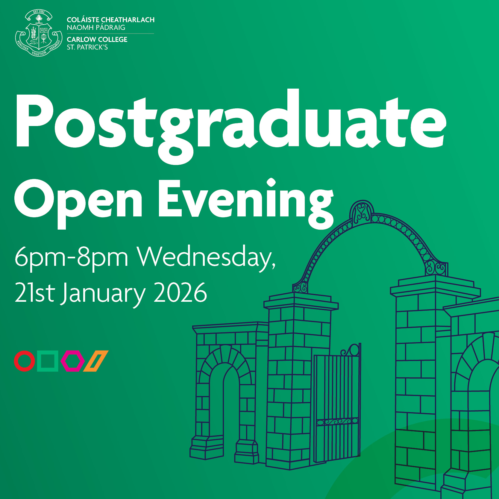 Join us for our Postgraduate Open Evening on Wednesday, 21st January 2026 from 6pm – 8pm at Carlow College.Â
