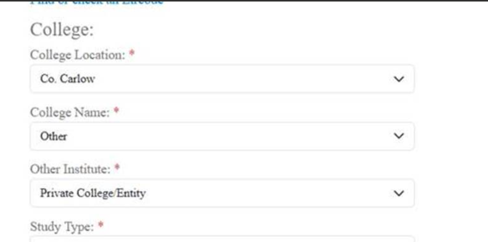 There is no specific option under the option ‘College Name’ for Carlow College, select the option Other.