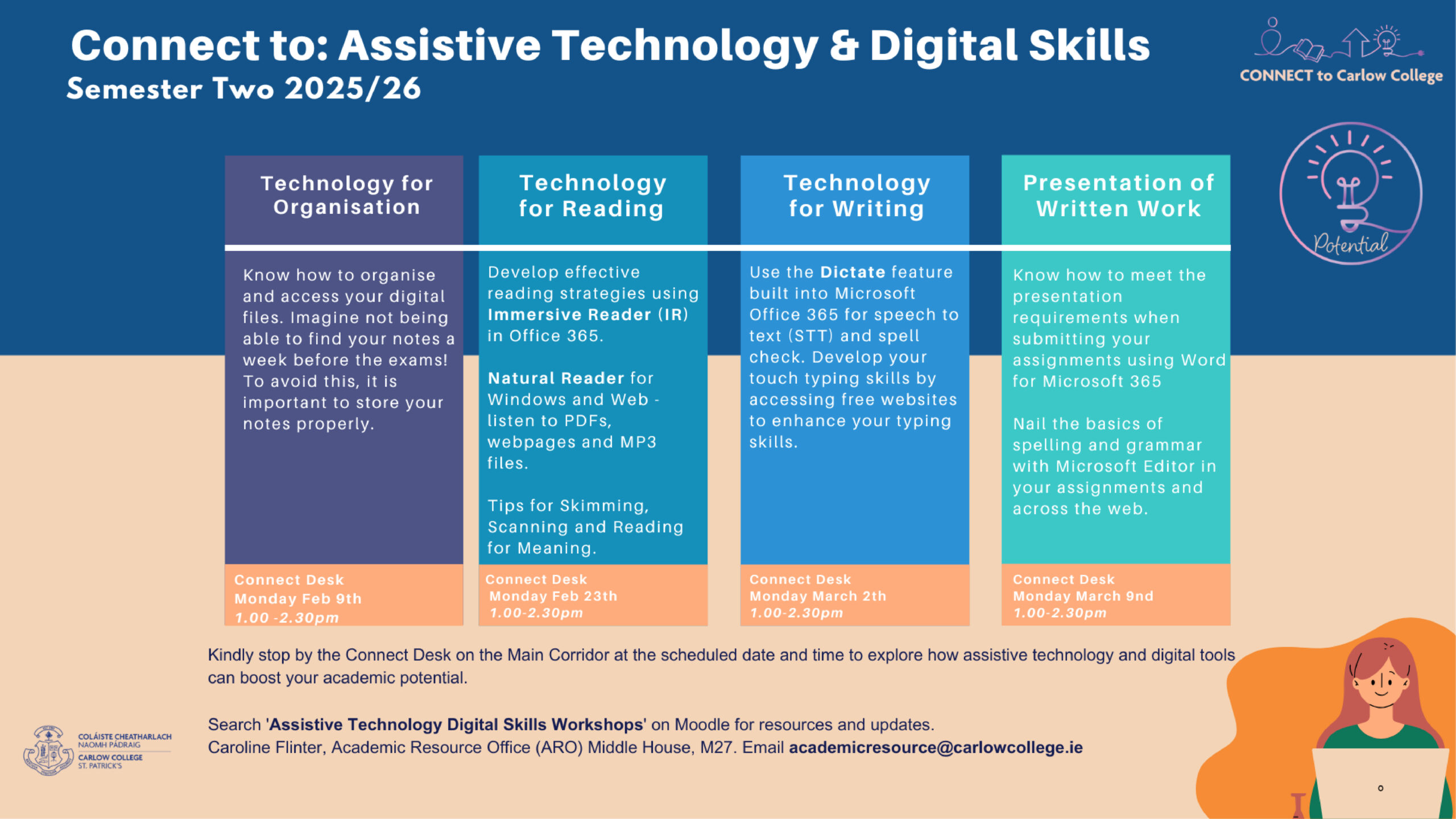 The Academic Resource Officer offers workshops throughout the semester to support students with their technology needs. Caroline will be available at the Connect Desk in